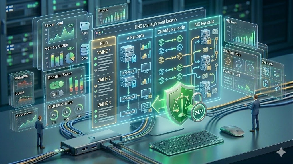 DNS (Domain Name System) on internetin puhelinluettelo. Hostingpalvelun hallintapaneelista voit muokata A-tietueita (osoittamaan palvelimelle), MX-tietueita (sähköposti) ja TXT-tietueita (varmennukset).
