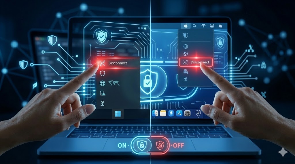 Mikäli olet konfiguroinut VPN-yhteyden suoraan Windowsin ”Verkko ja internet” -asetuksiin tai macOS:n ”Verkko”-valikkoon ilman erillistä sovellusta, sulkeminen vaatii muutaman lisävaiheen. Windows 11:ssä voit klikata tehtäväpalkin verkkokuvaketta ja valita VPN-kohdasta ”Katkaise yhteys”. Macilla vastaava toiminto löytyy yläpalkin valikosta tai Järjestelmäasetuksista.